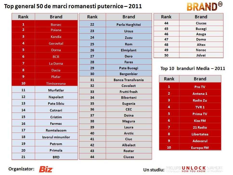- Borsec, Poiana, Kandia, Gerovital, Dorna, BCR, La Dorna, Dacia, Plafar si Timisoreana sunt marcile care conduc in clasamentul celor mai puternice 50 branduri romanesti in 2011, conform studiului lansat astazi de catre revista Biz si Unlock Market Research in cadrul conferintei BrandRo.
